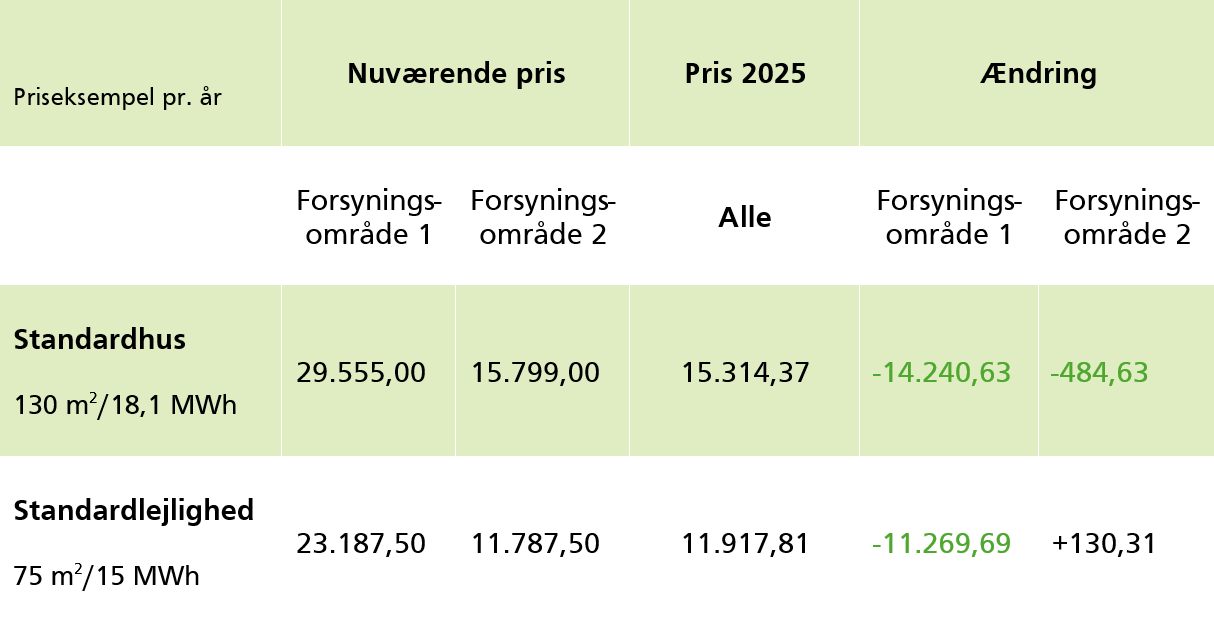 For kunderne i det nuværende Forsyningsområde 1 falder varmeprisen ca. 48% for et standardhus, hvilket svarer til 14.240,63 kr. om året. og ca. 49% for en standardlejlighed, hvilket svarer til et fald på 11.269,69 kr. om året.