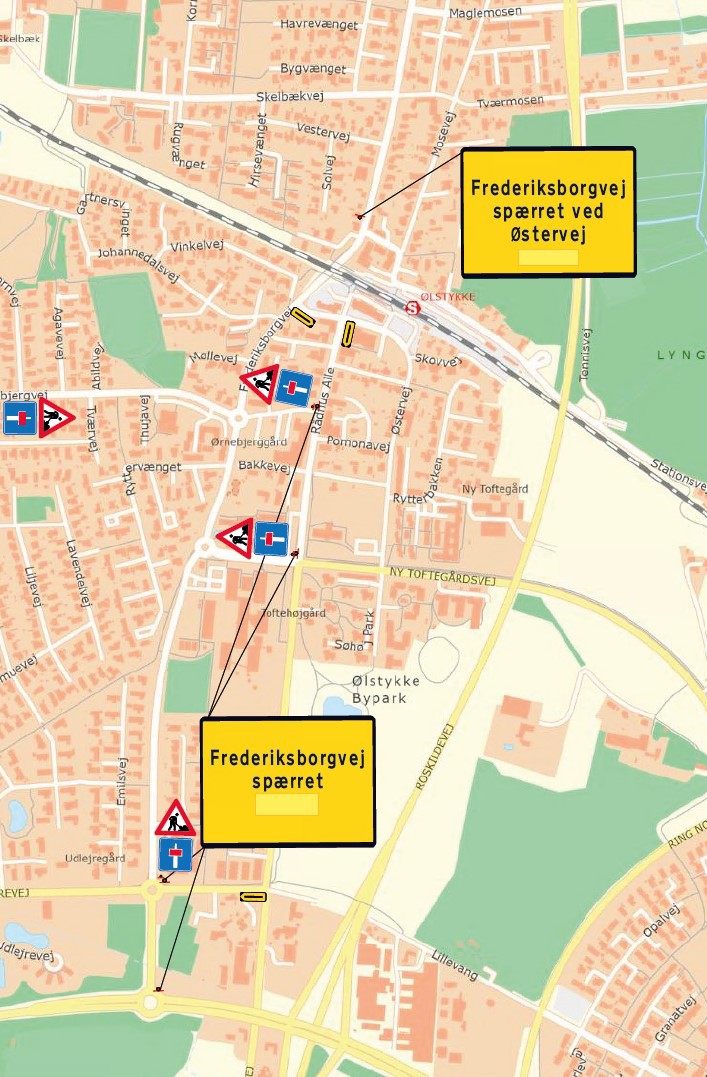 Under anlægsarbejdet, vil Frederiksborgvej være ensrettet i nordgående retning og med omkørsel af Østervej for sydgående biler og tung trafik. Fodgængere og cyklister kan benytte Frederiksborgvej i begge retninger.