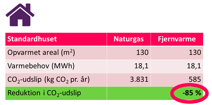 Har du f.eks. et hus på 130 m2, kan du år efter år spare miljøet for næsten 3,2 ton CO2 ved at skifte fra f.eks. gas til fjernvarme. Det svarer til, at du hvert år planter 15 træer, som får lov at stå i 90 år.